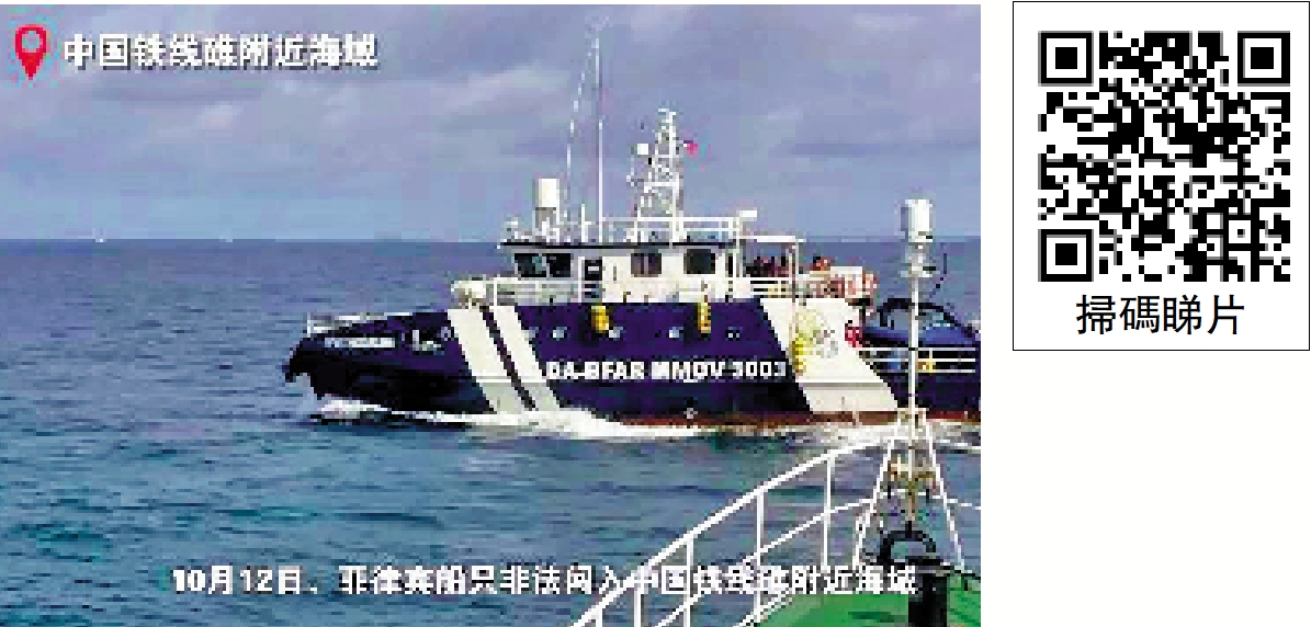 【大公報訊】記者馬靜北京報道:中國海警局新聞發言人劉德軍12日發表談話表示,10月12日,菲律賓3002、3003號公務船未經中國政府允許,非法闖入中國南沙群島鐵線礁附近海域。9時19分,菲3003船無視中方多次嚴正警告,危險接近中方正常維權執法的海警21559艇,導致發生擦碰,責任完全在菲方。