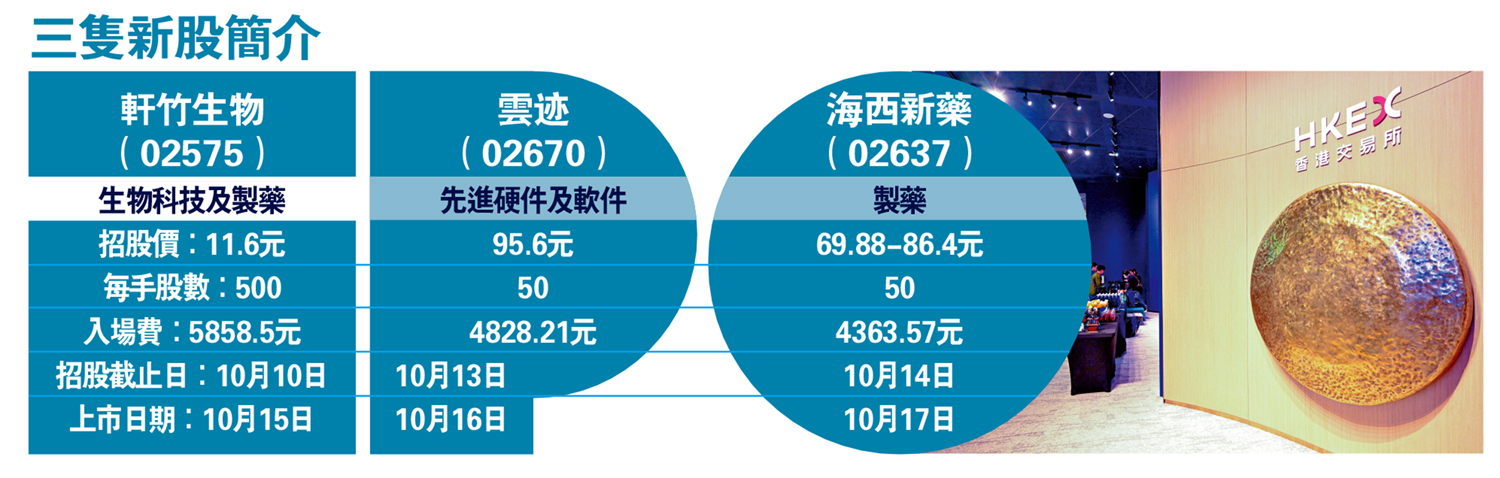 新股市場動態方面,四環醫藥(00460)旗下生物製藥公司軒竹生物(02575)上周完成公開認購,公開發售部分獲券商借出3093.9億元孖展資金,超額認購3960倍。該公司預計於周三(15日)正式掛牌。