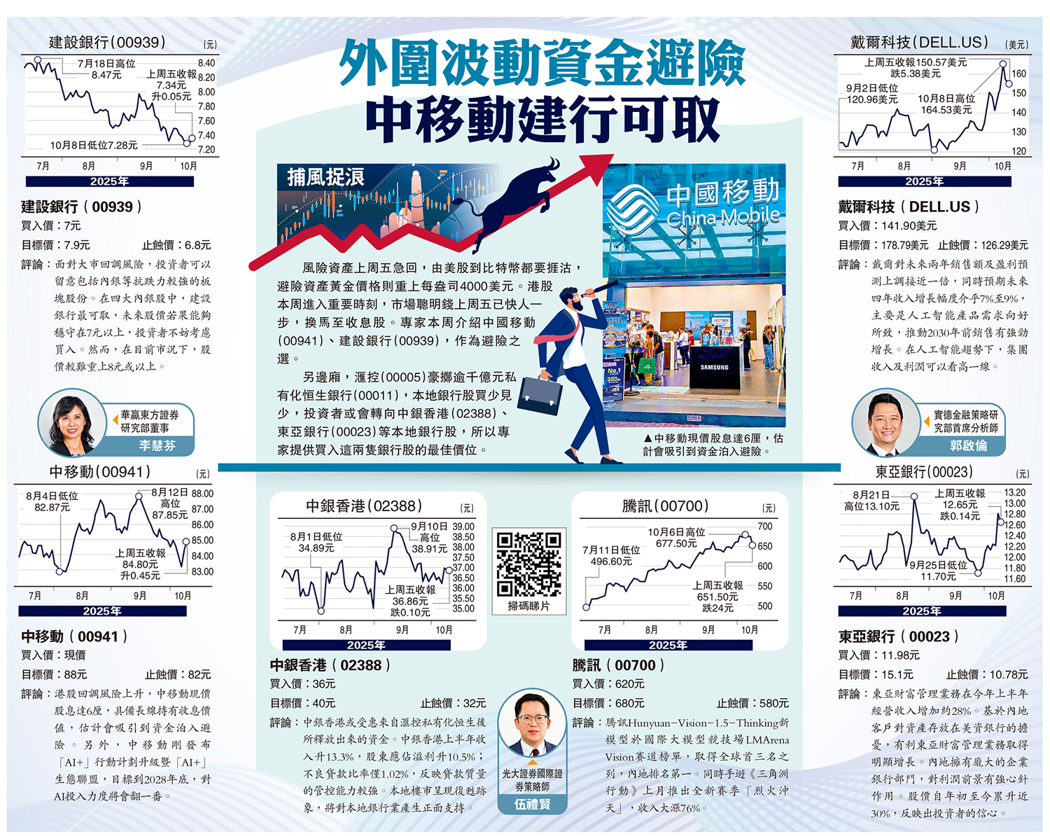 風險資產上周五急回,由美股到比特幣都要捱沽,避險資產黃金價格則重上每盎司4000美元。港股本周進入重要時刻,市場聰明錢上周五已快人一步,換馬至收息股。專家本周介紹中國移動(00941)、建設銀行(00939),作為避險之選。