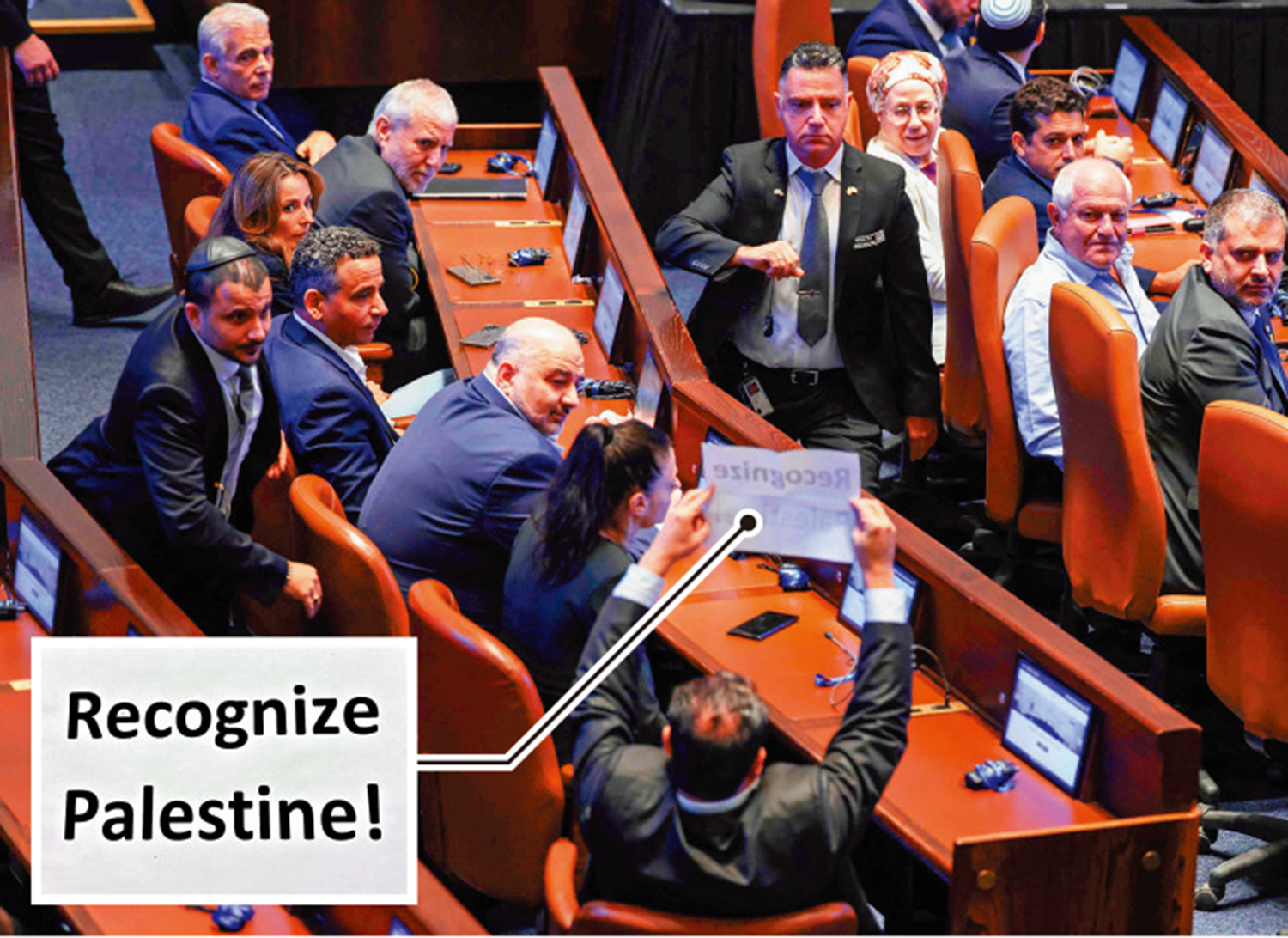 以色列左翼議員奧德和卡西夫高聲抗議,並舉起「承認巴勒斯坦國」的標語,被安保人員逐出議會。奧德說,他被逐出議會只是因為「提出了一個最簡單的要求,一個國際社會都認同的要求:承認巴勒斯坦國」。奧德表示:「這場會議上的虛偽程度令人難以忍受……只有(以色列)結束佔領,承認巴勒斯坦國,才能為所有人帶來正義、和平與安全。」他在社交媒體發文稱:「用奉承為內塔尼亞胡加冕,並不能免除他和他的政府在加沙犯下的反人類罪行。」