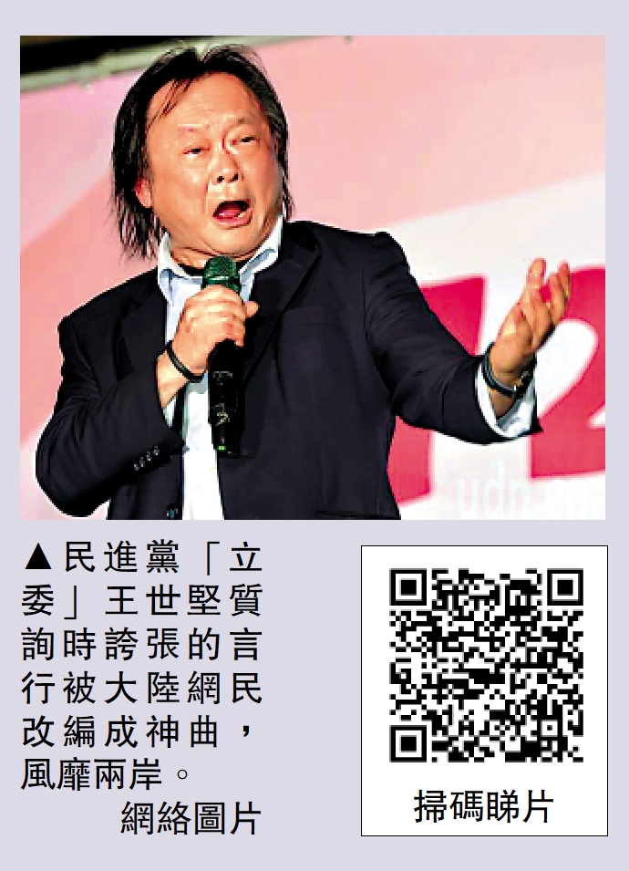 【大公報訊】據中通社報道:民進黨「立委」王世堅常常以質詢時的「發言」和「禮物」,受到兩岸網友的關注和熱議。近日,有大陸網友將他質詢時的發言改編成歌曲「沒出息」迅速在社交平台風靡。