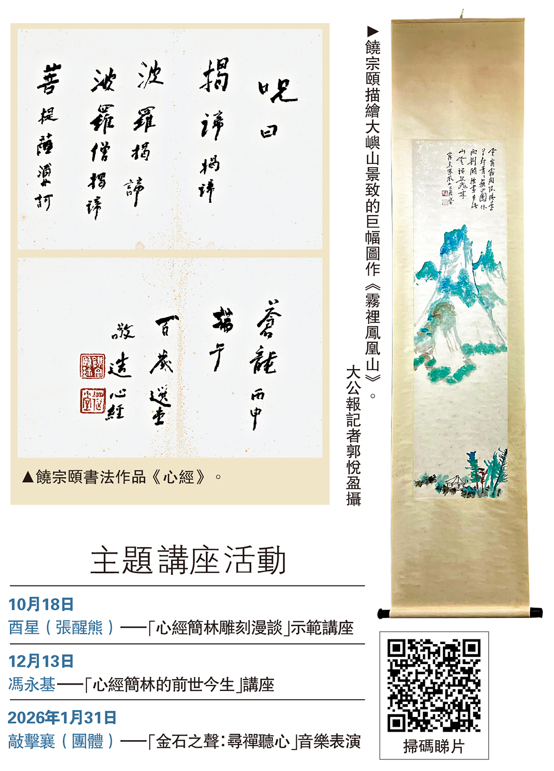 適逢大嶼山「心經簡林」落成20周年,香港大學饒宗頤學術館與一新美術館聯合主辦的「般若墨妙:饒宗頤的《心經》與『心經簡林』」專題展覽現正於一新美術館進行。展覽匯聚饒宗頤的《心經》書法原作及相關繪畫作品,呈現藝術多樣性,並引領觀眾回望「心經簡林」的文化淵源與精神價值。是次展覽亦呼應一新美術館遷館一周年,期望藉此深化大眾對饒宗頤藝術與佛學文化的認識。由於部分作品尺幅較大,展覽分兩期進行,展期至2026年3月1日,免費入場。\大公報記者 郭悅盈、龔學青