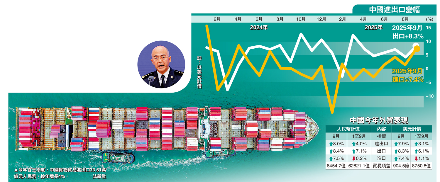 中國9月外貿增長超預期,按人民幣計價,當月進出口增長8%。其中,出口和進口分別增8.4%及7.5%。按美元計價,中國9月進出口增7.9%。其中,出口增8.3%,為今月3月以來最大增幅;進口增7.4%,則是去年4月以來最大增幅。
