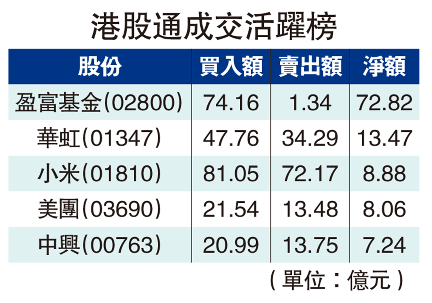 【大公報訊】港股遭遇投資者拋售,南下資金卻積極入市部署,北水投資者昨日經由港股通買入1234.11億元,較上日增加47%,扣除賣出額,淨買入198.04億元,是8月15日以來最多。久違的盈富基金(02800)重新進入港股通活躍股份榜單,南下資金合共買入74.16億元,扣除賣出額,淨買入達72.82億元,是吸金量最多的股份。