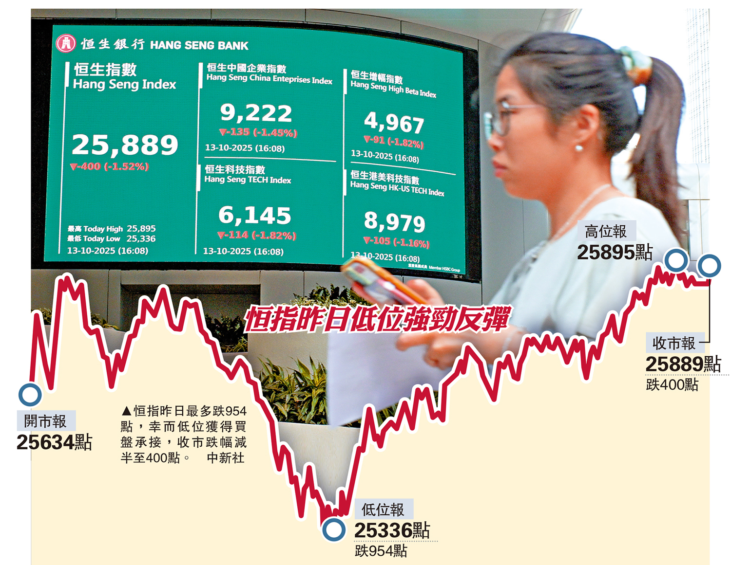 亞太區市場昨日普遍跳水下跌,恒指低開656點,中段跌幅擴大至954點,低見25336點。午後市況轉好,恒指收市時跌400點,報25889點,兼且重上50天線(25802點)的心理支持位。大市成交活躍,主板成交額4903億元,較上日增加46%,是歷來第四大成交額。重磅科技股在低位出現後抽,令到指數昨日收復半數失地。阿里巴巴昨日股價最多跌5.6%,收市時跌1.6%,報162.6元;騰訊股價曾跌4.4%,收市跌1.9%,報639元。