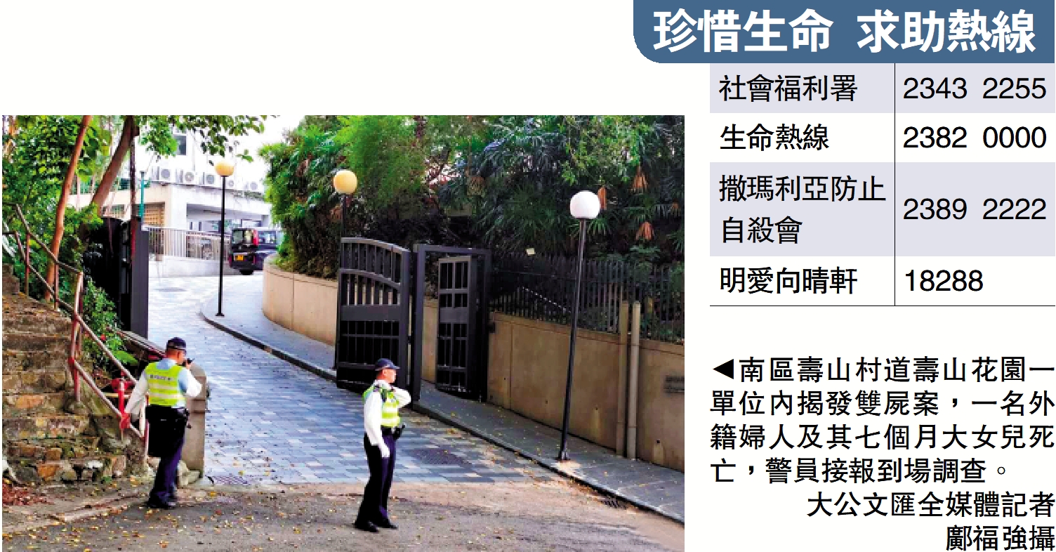 【大公報訊】記者黃知行報道:港島南區豪宅發生雙屍案。昨日(13日)下午4時許,警方接獲一名法籍男子報案,指其34歲、持香港身份證的法籍妻子於壽山村道6A壽山花園一單位內吊頸自殺,其七個月大女兒亦在廚房內昏迷不醒。救護人員接報到場,經檢驗後發現兩人當場不治。警方將案件列作「殺嬰」及「自殺」跟進。