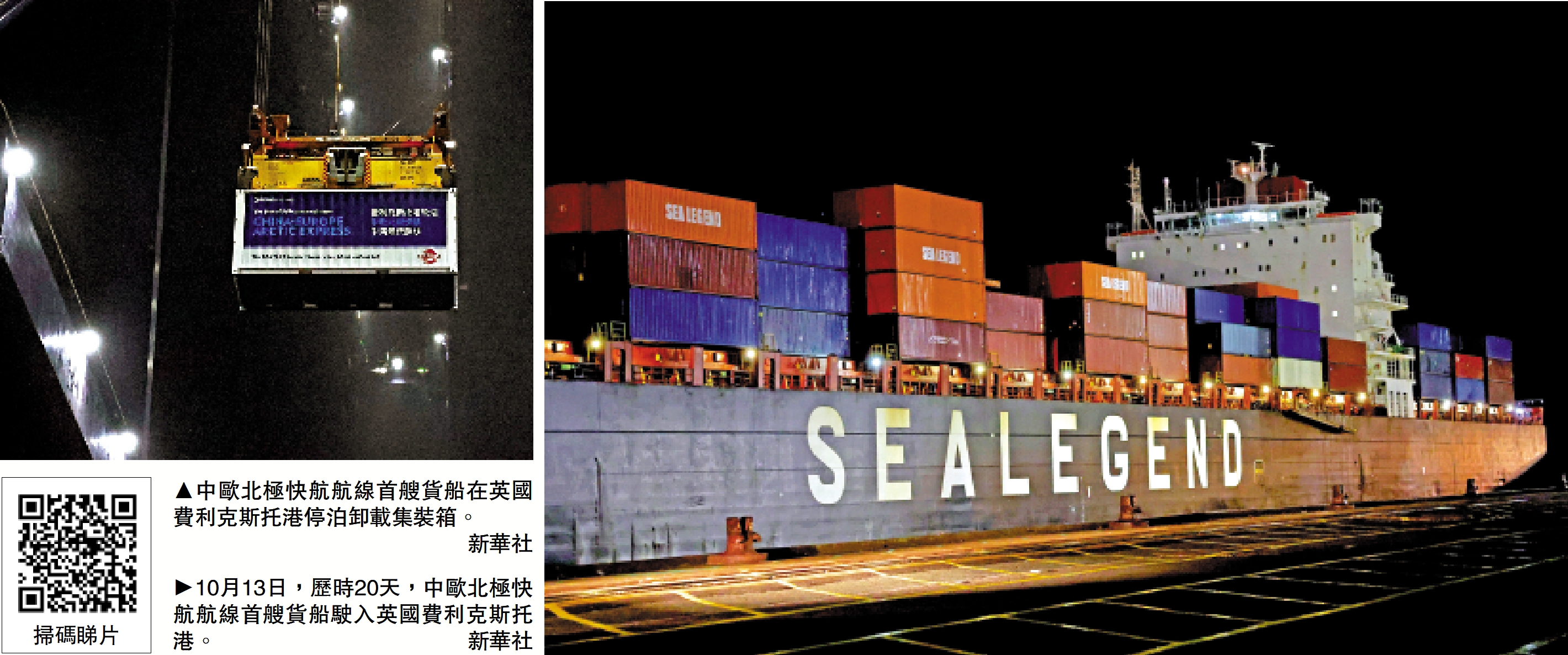 【大公報訊】綜合新華社、央視新聞、人民日報海外版報道:負責該航線的海傑航運(香港)有限公司首席運營官李曉斌在集裝箱卸載現場介紹,中歐北極快航航線的海況溫度適合運輸熱敏貨物和時效性要求較高的商品。該艘貨船主要運輸以新能源汽車、鋰電池、光伏產品為代表的「新三樣」商品。