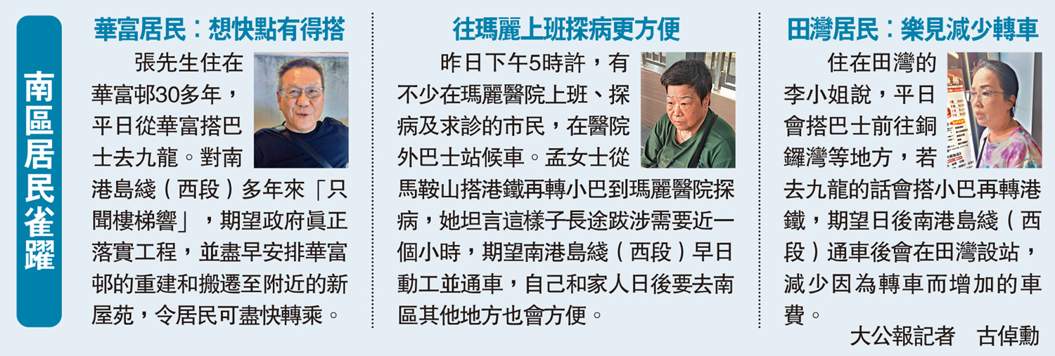 昨日下午5時許,有不少在瑪麗醫院上班﹑探病及求診的市民,在醫院外巴士站候車。孟女士從馬鞍山搭港鐵再轉小巴到瑪麗醫院探病,她坦言這樣子長途跋涉需要近一個小時,期望南港島綫(西段)早日動工並通車,自己和家人日後要去南區其他地方也會方便。