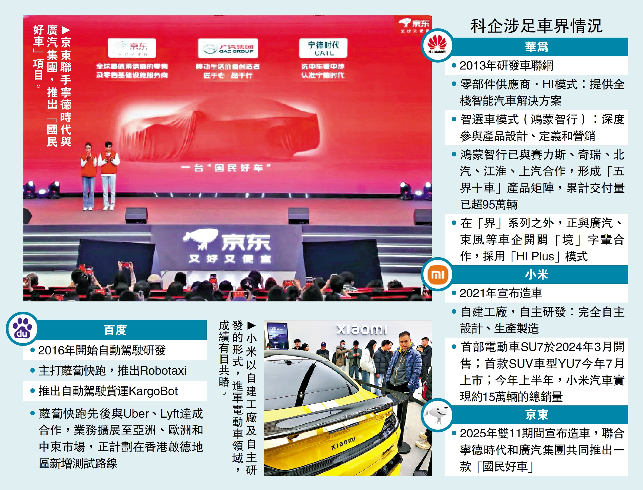 上圖﹕京東聯手寧德時代與廣汽集團,推出「國民好車」項目。下圖﹕小米以自建工廠及自主研發的形式,進軍電動車領域,成績有目共睹。