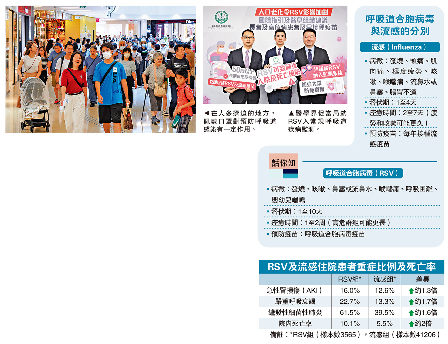 此外,本港早前研究已明確,RSV的威脅顯著高於流感:相比流感,感染RSV後出現併發症的機率更高,不僅更容易發展成嚴重情況,患者死亡率亦顯著偏高。即使與未接種流感疫苗的流感住院患者相比,RSV住院患者面臨的死亡率、嚴重呼吸困難及細菌性肺炎風險仍更高,足見RSV的嚴重性遠超流感。