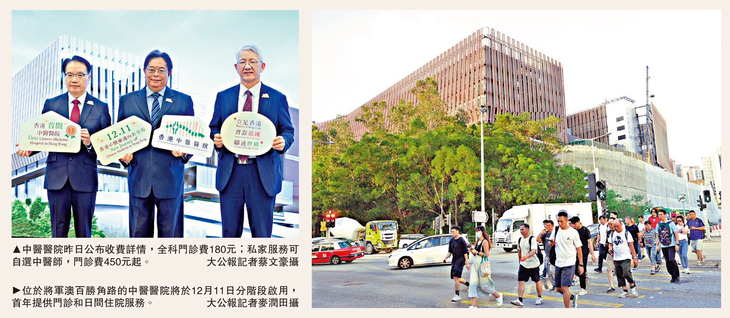 位於將軍澳百勝角路的中醫醫院,將於12月11日開始分階段啟用,提供以中醫為主及中西醫協作的服務,首年提供門診和日間住院服務。中醫醫院昨日公布收費詳情,政府資助服務的全科門診費180元;若選擇市場主導的服務,可自選中醫師,門診費450元起,首年部分服務設有七至九折優惠。中醫醫院表示,收費訂價已考慮市場價格、市民負擔能力及成本等因素,有市民認為收費可以接受,雖貴過政府中醫診所,但分科細緻且收費透明,惟擔心輪候時間太長。\大公報記者 王亞毛