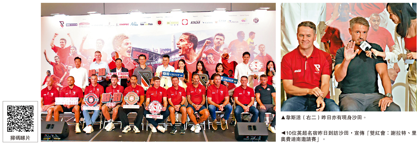 「雙紅會:謝拉特、里奧費迪南邀請賽」將於18日(周六)下午5時在啟德體育園主場館舉行。主辦單位指出購票人數已打破歷年名宿球賽紀錄,其中399元及紅軍球迷區999元門票均已售罄。為提前炒熱賽事氣氛,兩隊隊長謝拉特與里奧費迪南昨天率領奧雲、卡域克和尼曼查維迪等一眾參賽傳奇球星,現身沙田新城市廣場舉行記者會並與球迷互動。現場聚集上百名熱情球迷一睹球星風采,球員們也展現親和力,現場展示腳法並送出簽名足球。\大公報記者 張銳(文、圖)