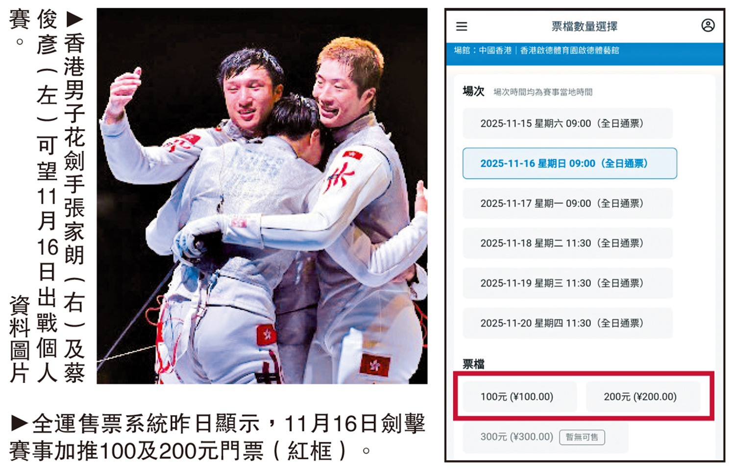 【大公報訊】第15屆全運會第三批次賽事門票周四(16日)上午10時起公開發售,今次開售的為廣東賽區13個項目,其中羽毛球、籃球(男子成年組、女子成年組)及游泳為熱門項目。至於香港賽區項目中,劍擊自9月20日開售以來反應熱烈,11月16日門票更不足兩日便售罄,文化體育及旅遊局日前公布,劍擊再調整線上、線下門票分配,記者昨日在購票網站所見,第2日賽事(11月16日)門票,除了最貴300元(人民幣,下同)依然售罄,其餘100及200元則有門票出售。