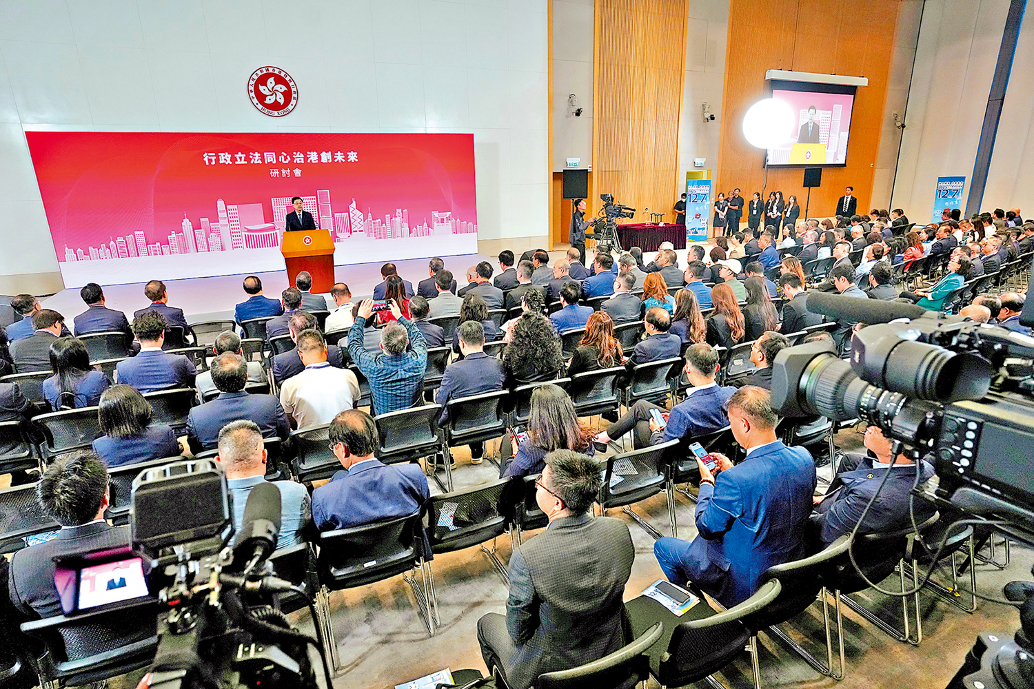 特區政府昨日(16日)舉辦「行政立法同心治港創未來」研討會,旨在加深社會大眾對行政立法機關相互促進,對「一國兩制」行穩致遠以至特區良政善治重要性的認識,眾多愛國愛港團體、社會各界代表,以及專家學者出席。多位代表在會上發言以及會後見傳媒時表示,行政立法機關的相互促進十分重要,呼籲市民在立法會選舉時踴躍投票。\大公報記者 龔學鳴