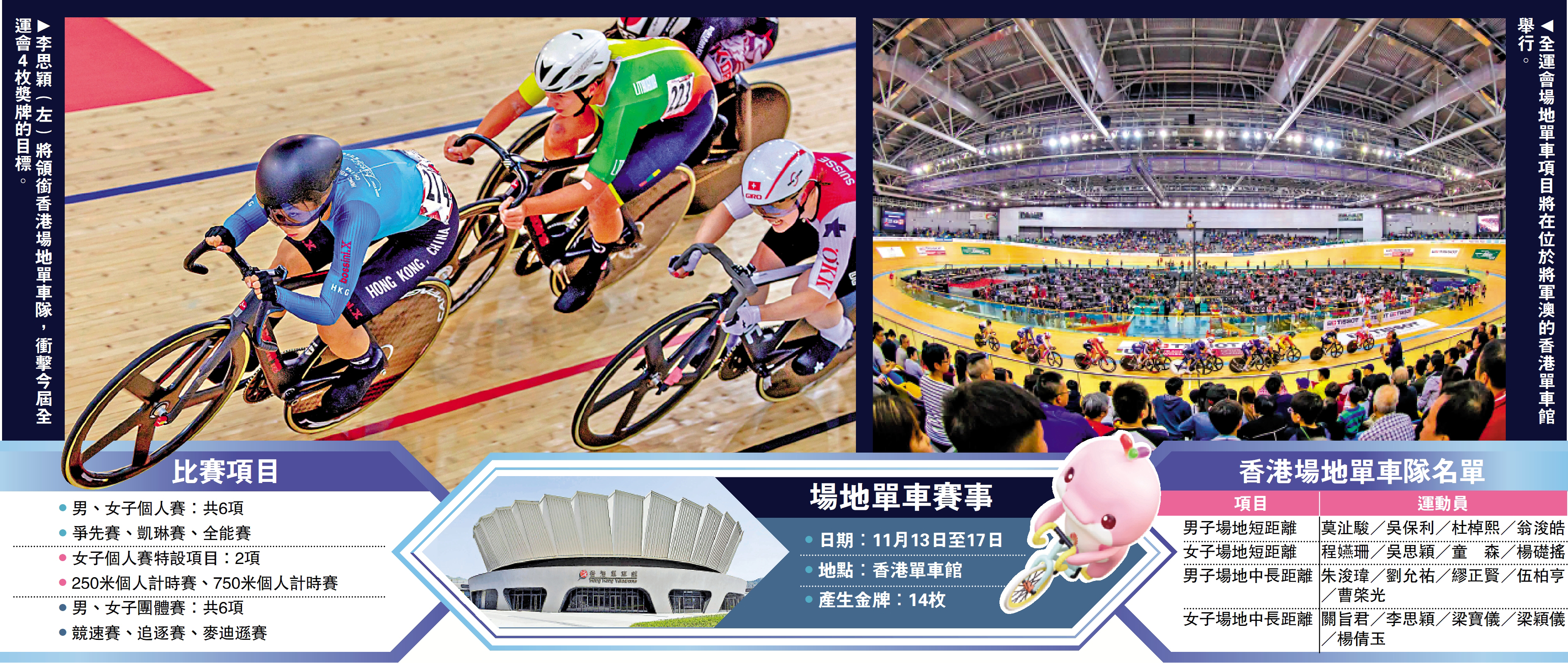 當中,港隊在女子組的麥迪遜賽、全能賽具衝獎牌實力,尤其是麥迪遜賽,無論是李思穎夥拍梁穎儀還是楊倩玉,港隊組合都有望藉主場優勢衝擊金牌。至於個人賽項目,除了李思穎、梁穎儀等女將之外,男子組的「黑馬」伍柏亨亦有望在本屆全運會大展身手,力爭站上領獎台。