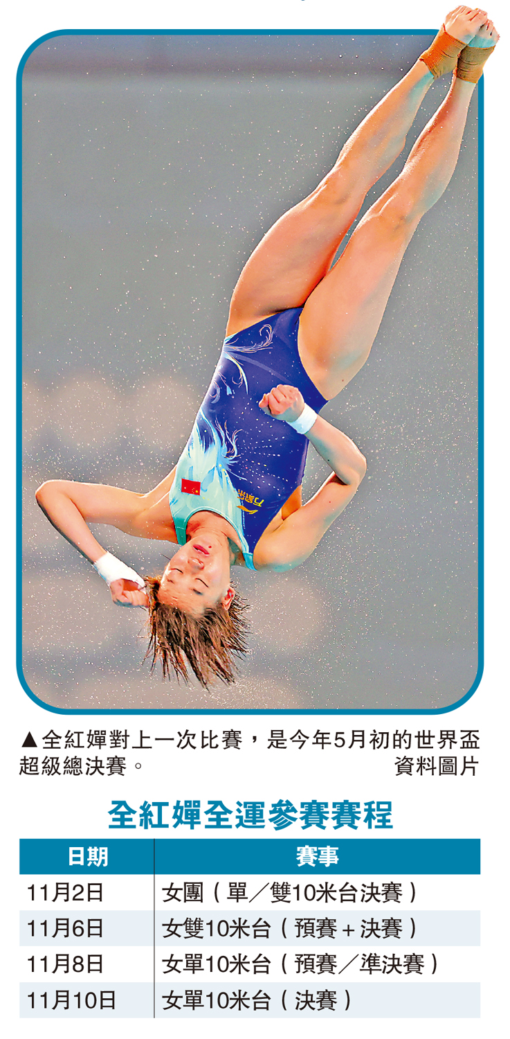 【大公報訊】據第15屆全運會官網消息,兩屆奧運會跳水冠軍全紅嬋將於11月初在全運會賽場復出,代表廣東隊參加女子團體、女子雙人10米台、女子單人10米台共3個項目的比賽,衝擊「3金后」。這是她自今年5月初北京世界盃超級總決賽後,時隔近半年重返賽場。