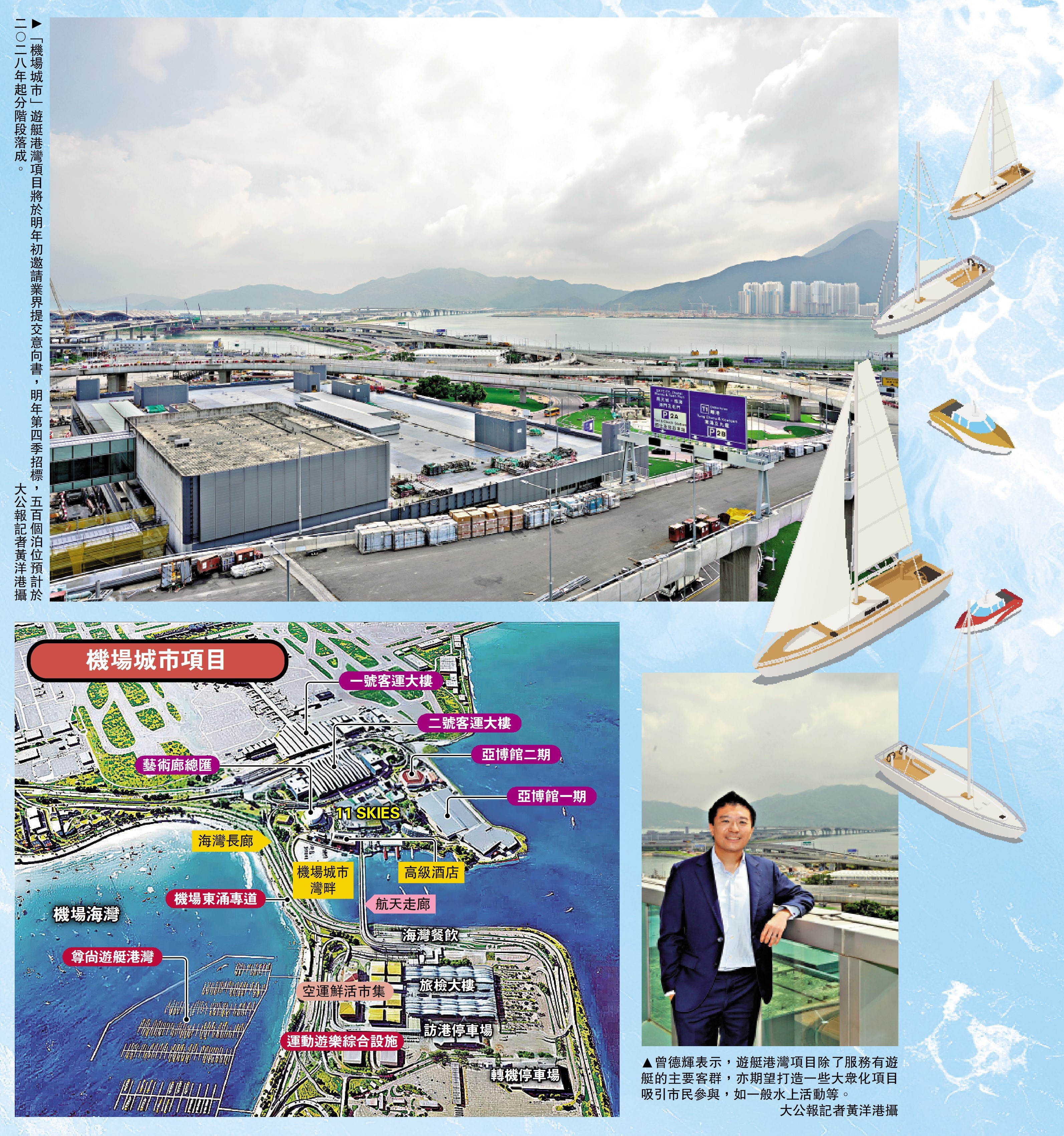 機場管理局接受《大公報》獨家訪問時表示,正全速推進遊艇港灣項目,計劃明年第四季進行招標,2028/29年分階段落成並投入營運,預計於機場城市灣畔的數十個泊位可最快推出。遊艇港灣將與機場城市「SKYTOPIA」的藝術和商業配套協同發展,打造高端消費圈,推動遊艇旅遊。機管局透露,項目落成後計劃舉辦高端遊艇賽事、展銷會等,促進相關產業發展。\大公報記者 易曉彤