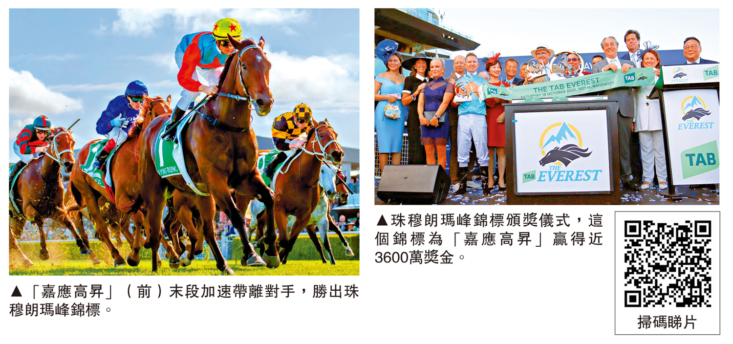 【大公報訊】記者梁潤森報道:中國香港馬王「嘉應高昇」創造輝煌歷史,18日(周六)在澳洲悉尼蘭域馬場舉行的珠穆朗瑪峰錦標(1200米一級賽)中,夥拍騎師潘頓一舉攻下這項全球最高獎金草地賽事,成為首匹贏得這項頂級賽事的香港賽駒,同時打破澳洲代表壟斷這項賽事冠軍的紀錄。賽後,「嘉應高昇」寫下14連勝佳績成為世界短途馬王者,盡展香港賽駒實力,潘頓及練馬師大衛希斯亦迎來他們策騎及從練生涯的巔峰。