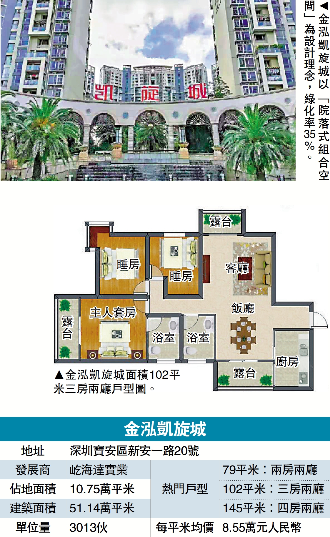 金泓凱旋城規模巨大,分兩期開發,共27幢塔樓,提供3013伙。項目以「院落式組合空間」為設計理念,融合濱海生態元素,綠化率35%,配套有11萬平米濕地園林、3.6萬平米主題花園及1200米商業街。項目主力戶型涵蓋79至218平米,間隔由兩房至四房。