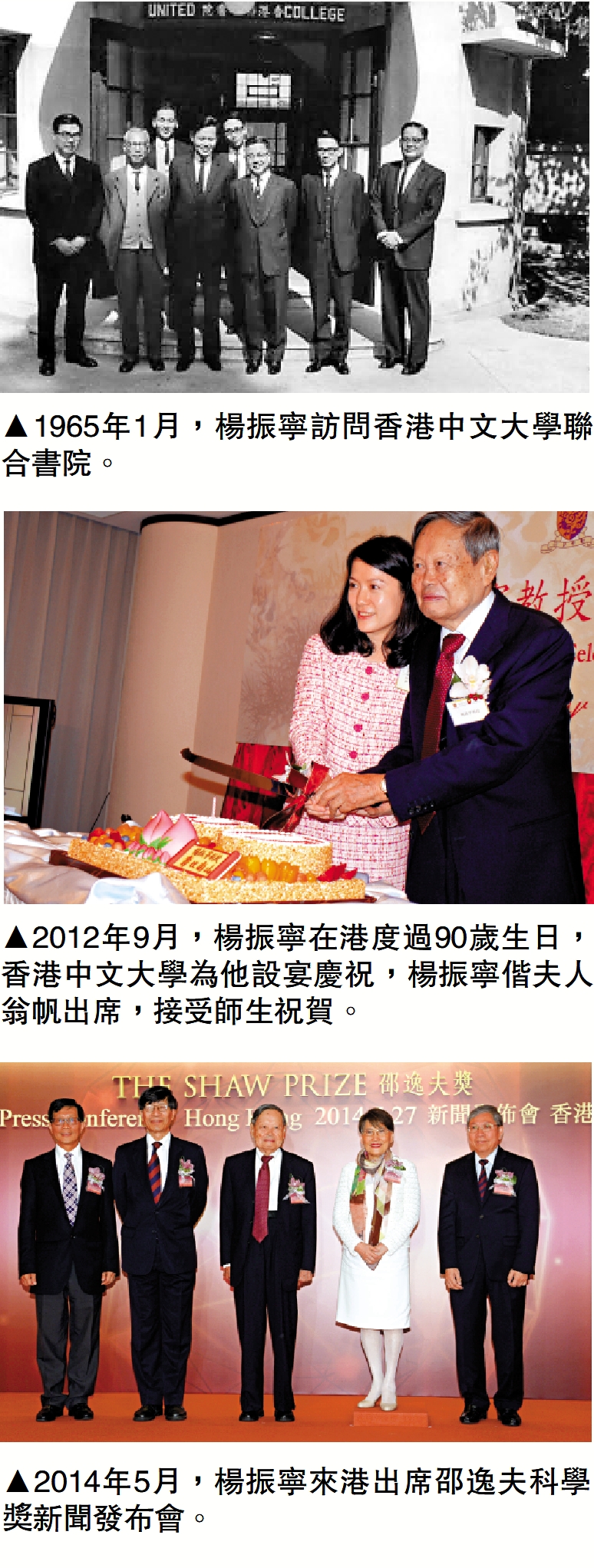 楊振寧於1997年獲中大頒授榮譽理學博士學位。1999年,他將包括諾貝爾獎在內的許多獎章、文章、信札、手稿慷慨捐贈予中大,大學於2002年設立楊振寧學術資料館收藏這些珍品。中大校長盧煜明教授表示:「楊振寧教授在物理學領域成就卓越,對中大學術發展貢獻良多,對中大師生,特別是年輕後輩關懷備至,總是循循善誘、傾囊相授。楊教授的離去對全球學術界,是無可估量的損失,但他留下的學術寶庫,將會繼續啟迪後人追求理論物理學的真諦。」