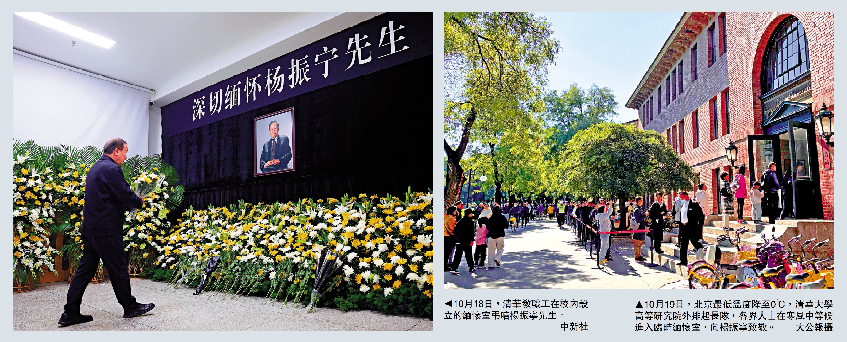 清華大學在楊振寧生前工作過的高等研究院設立臨時緬懷室,接受校內師生及社會人士弔唁。19日一早,弔唁人員在門外排成幾十米長隊,還有人專程從外地趕來悼念楊振寧先生。就讀清華大學的港生接受大公報記者採訪時表示,楊振寧先生不僅是科學巨匠,也是偉大的愛國者。\大公報記者 郭瀚林北京報道