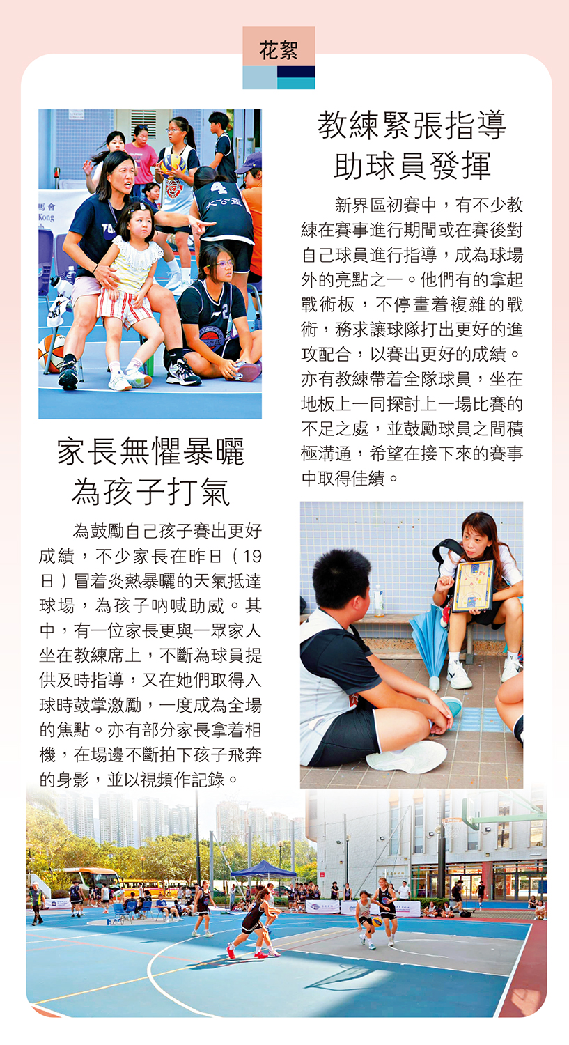 新界區初賽中,有不少教練在賽事進行期間或在賽後對自己球員進行指導,成為球場外的亮點之一。他們有的拿起戰術板,不停畫着複雜的戰術,務求讓球隊打出更好的進攻配合,以賽出更好的成績。亦有教練帶着全隊球員,坐在地板上一同探討上一場比賽的不足之處,並鼓勵球員之間積極溝通,希望在接下來的賽事中取得佳績。