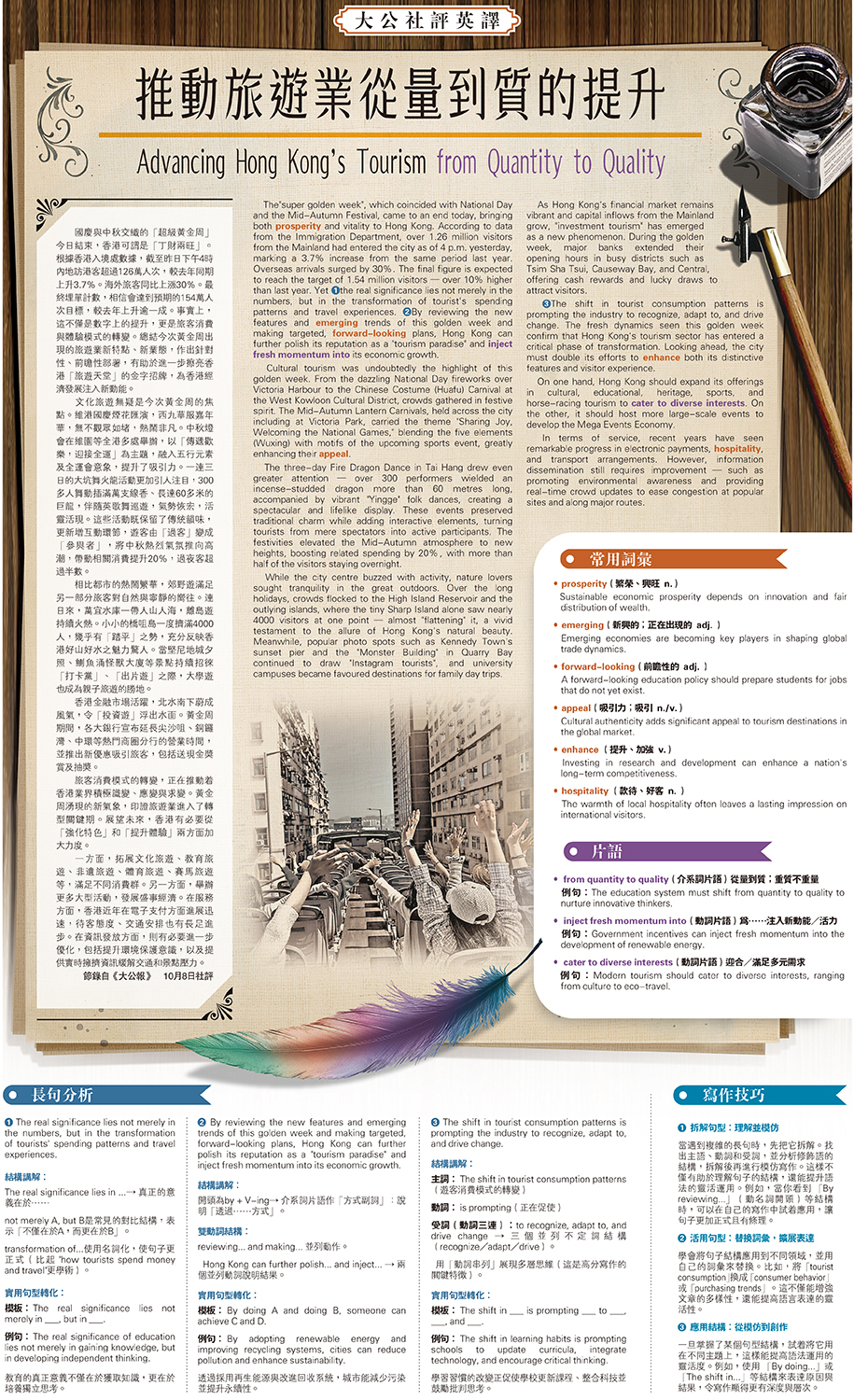 The"super golden week", which coincided with National Day and the Mid-Autumn Festival, came to an end today, bringing both prosperity and vitality to Hong Kong. According to data from the Immigration Department, over 1.26 million visitors from the Mainland had entered the city as of 4 p.m. yesterday, marking a 3.7% increase from the same period last year. Overseas arrivals surged by 30%. The final figure is expected to reach the target of 1.54 million visitors — over 10% higher than last year. Yet 1the real significance lies not merely in the numbers, but in the transformation of tourist's spending patterns and travel experiences. 2By reviewing the new features and emerging trends of this golden week and making targeted, forward-looking plans, Hong Kong can further polish its reputation as a "tourism paradise" and inject fresh momentum into its economic growth.