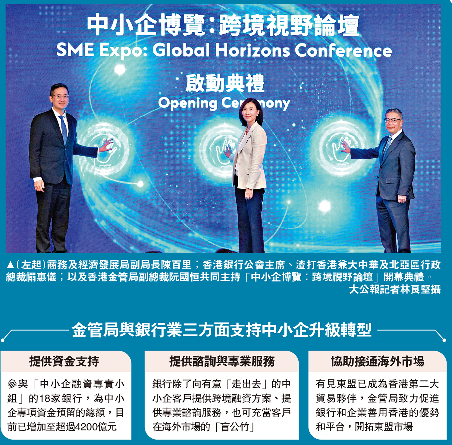香港金融管理局與香港銀行業界積極支持中小企升級轉型,以協助面對持續波動的外圍環境。金管局副總裁阮國恒表示,非常明白中小企需要求變的迫切性,當局一直致力於支持中小企持續發展,尤其在資金、提供諮詢和專業服務,以及建立網絡三方面協助企業拓展跨境業務。\大公報記者 黃裕慶