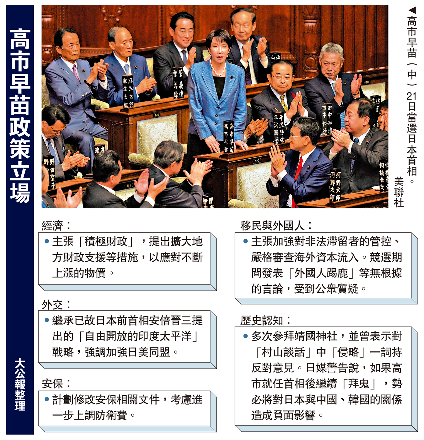 •多次參拜靖國神社,並曾表示對「村山談話」中「侵略」一詞持反對意見。日媒警告說,如果高市就任首相後繼續「拜鬼」,勢必將對日本與中國、韓國的關係造成負面影響。