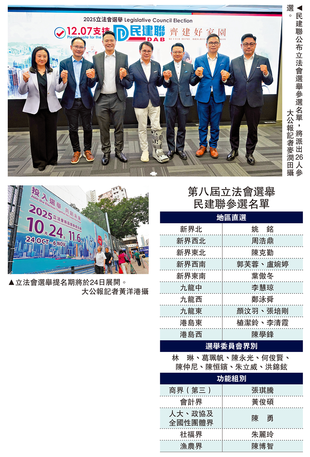 立法會換屆選舉將於12月7日舉行,提名期將於本周五(24日)展開。民建聯昨日(21日)舉行執行委員會會議,討論及通過今年立法會選舉參選名單、參選口號和政綱。會後,民建聯主席陳克勤及副主席、秘書長見記者。陳克勤宣布,將派出26人出選,13人參與地區直選,5人參選功能組別,8人參選選委界。