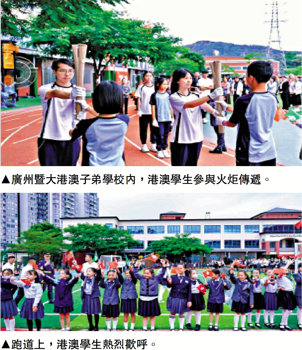 上圖﹕廣州暨大港澳子弟學校內,港澳學生參與火炬傳遞。下圖﹕跑道上,港澳學生熱烈歡呼。