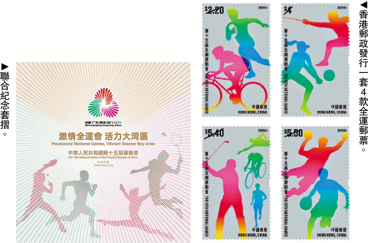左圖﹕聯合紀念套摺。右圖﹕香港郵政發行一套4款全運郵票。
