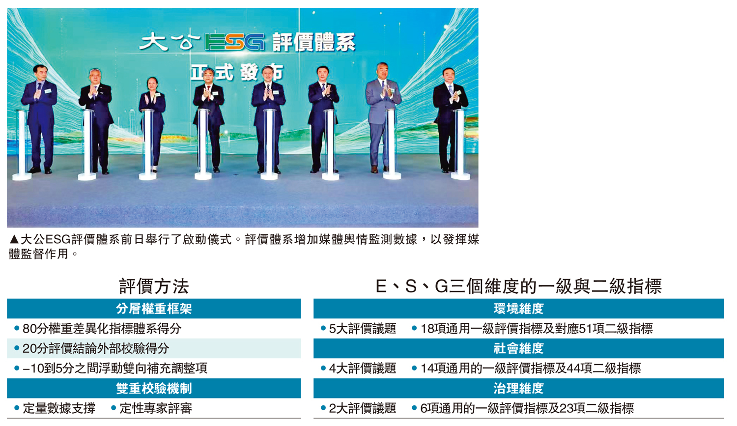 數據來源方面,大公ESG評價體系將採取企業官方公開披露,監管和第三方公開數據、國際主流ESG評級結果等資料,其中特別增加了媒體輿情監測數據作為補充調整項,以充分發揮媒體監督作用。