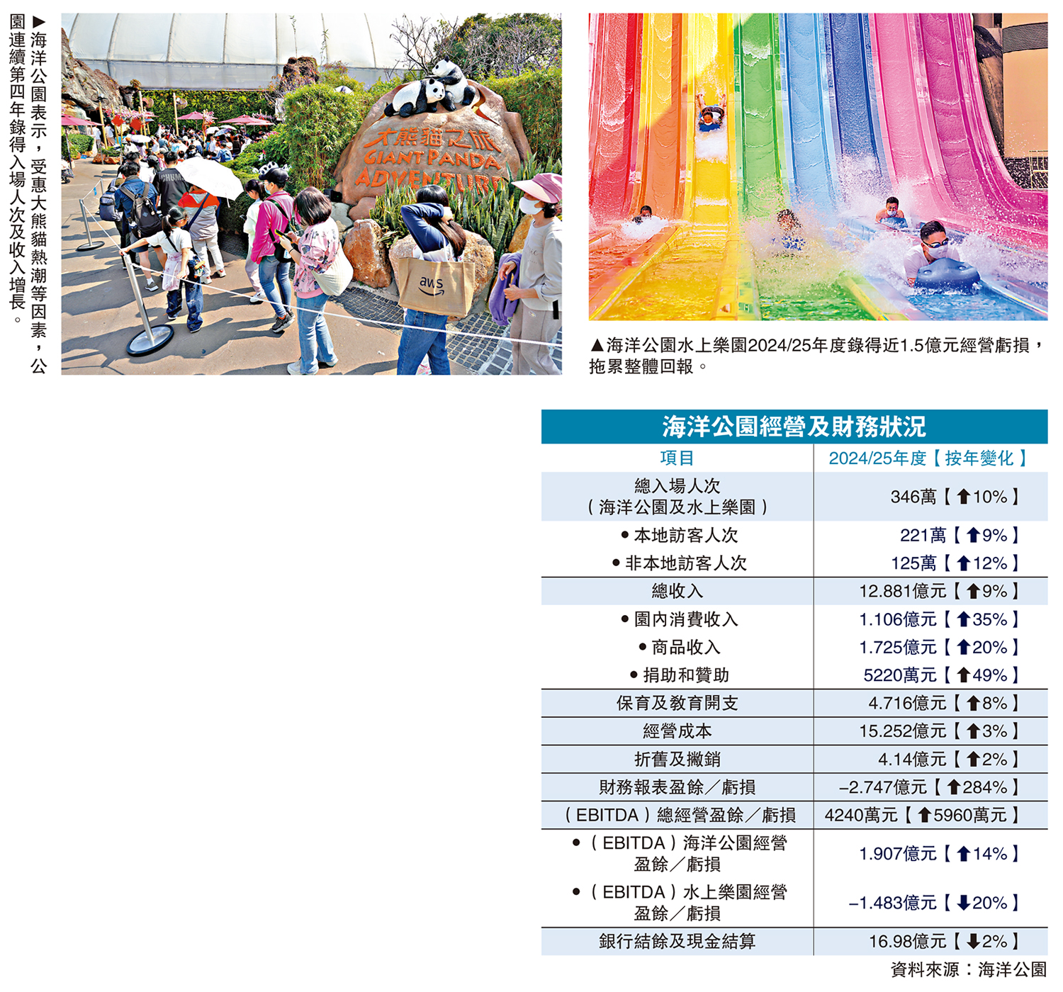 【大公報訊】記者鄭文迪、伍軒沛報道:海洋公園昨日公布2024/25年度業績,受惠訪港旅客上升及大熊貓效應,公園入場人次和收入連續四年上升,並錄得約4240萬元經營盈餘,但水上樂園持續虧蝕,加上折舊等減值回撥,上年度整體虧損擴大至超過2.7億元。有學者認為,海洋公園成功抓住了大熊貓商機,惟近年市場變化大,園方需密切留意市場變化,適時作出調整;至於持續出現虧損的水上樂園,建議多搞不同活動,例如水上演唱會或其他聯乘活動,豐富遊客體驗。