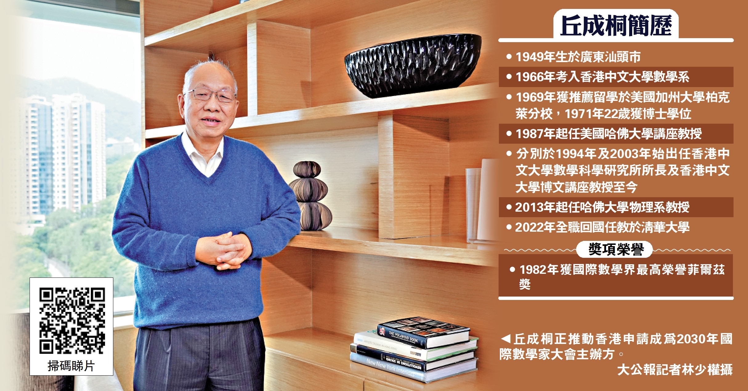 曾獲菲爾茲獎的著名數學家丘成桐,正推動香港申請成為2030年國際數學家大會主辦方。近日,他接受《大公報》專訪時指出,香港憑藉中西文化交匯的獨特定位、深厚的數學人才積累及開放優勢,在競爭中頗具潛力。問及數學人才培養,他表示,當前香港數學教育最關鍵的問題是學生對數學研究的興趣不足,但未來或可通過AI重新激發學生的研究興趣。\大公報記者 邱梓茵