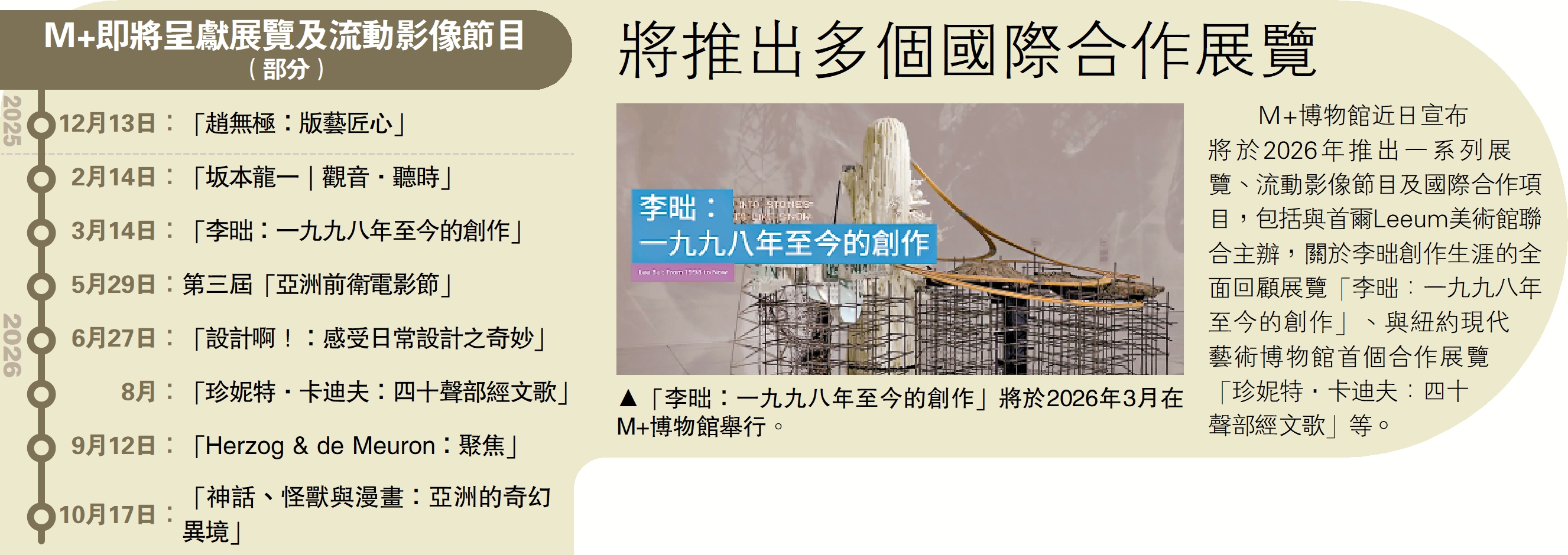M+博物館近日宣布將於2026年推出一系列展覽、流動影像節目及國際合作項目,包括與首爾Leeum美術館聯合主辦,關於李昢創作生涯的全面回顧展覽「李昢:一九九八年至今的創作」、與紐約現代藝術博物館首個合作展覽「珍妮特·卡迪夫:四十聲部經文歌」等。