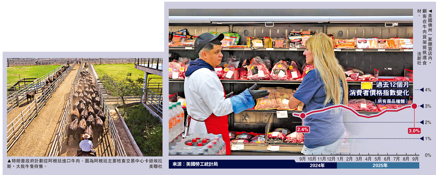 【大公報訊】受特朗普關稅政策影響,美國國內物價持續攀升。美國勞工統計局24日公布最新數據顯示,美國9月份消費者價格指數(CPI)上漲 0.3%,推動年通脹率從2.9%升至3%,創下自今年1月以來的最高水平。其中,作為美國家庭主要食材的牛肉,今年價格漲幅顯著上升。截至今年9月,絞碎牛肉零售價格在過去一年間上漲12.9%,牛排價格更攀升16.6%,遠超一般食品3.1%的通脹率。