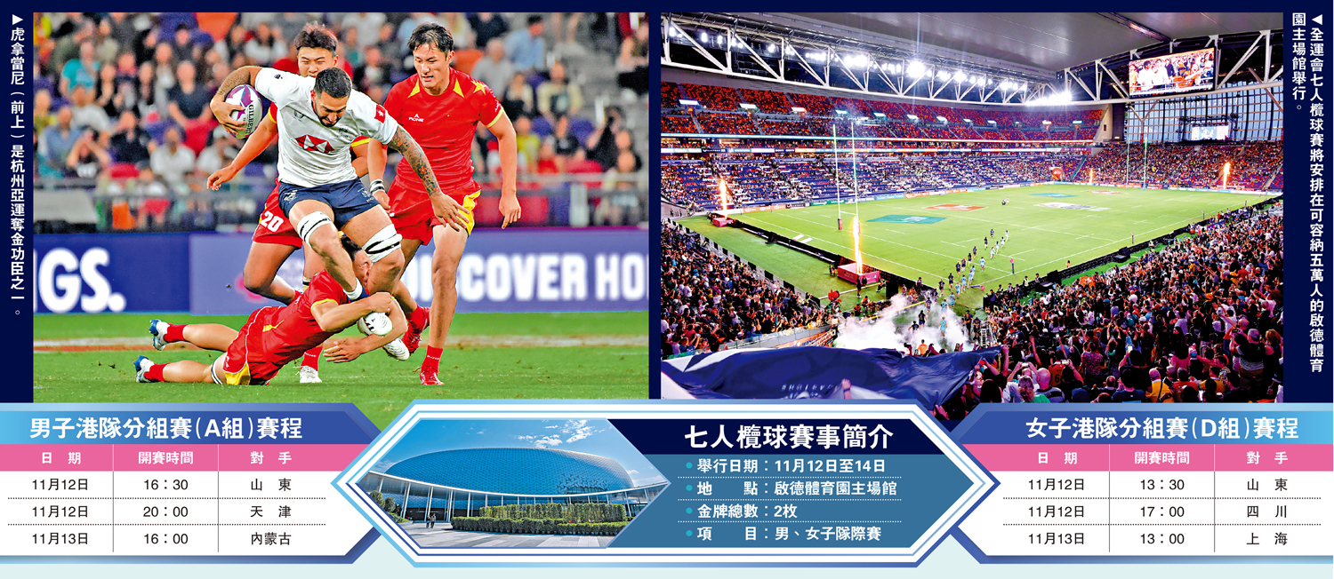 啟德體育園正式開幕後,首項體育賽事就是香港國際七人欖球賽,賽事亦辦得有聲有色,在那3天的盛大派對上中外觀眾全部盡興而歸,透過賽事亦向全世界展示出本港已具備一個更加現代化的頂級體育場館。今屆全運會七人欖球為本港承辦項目之一,為期3天的賽事亦會在可容納5萬人的啟德體育園主場館舉行,將是港辦項目中最大和最多觀眾的比賽場館,除了在港的華洋觀眾外,也勢必吸引內地觀眾入場為各自省隊打氣,繼續將全運氣氛推上高峰。\大公報記者 譚德龍