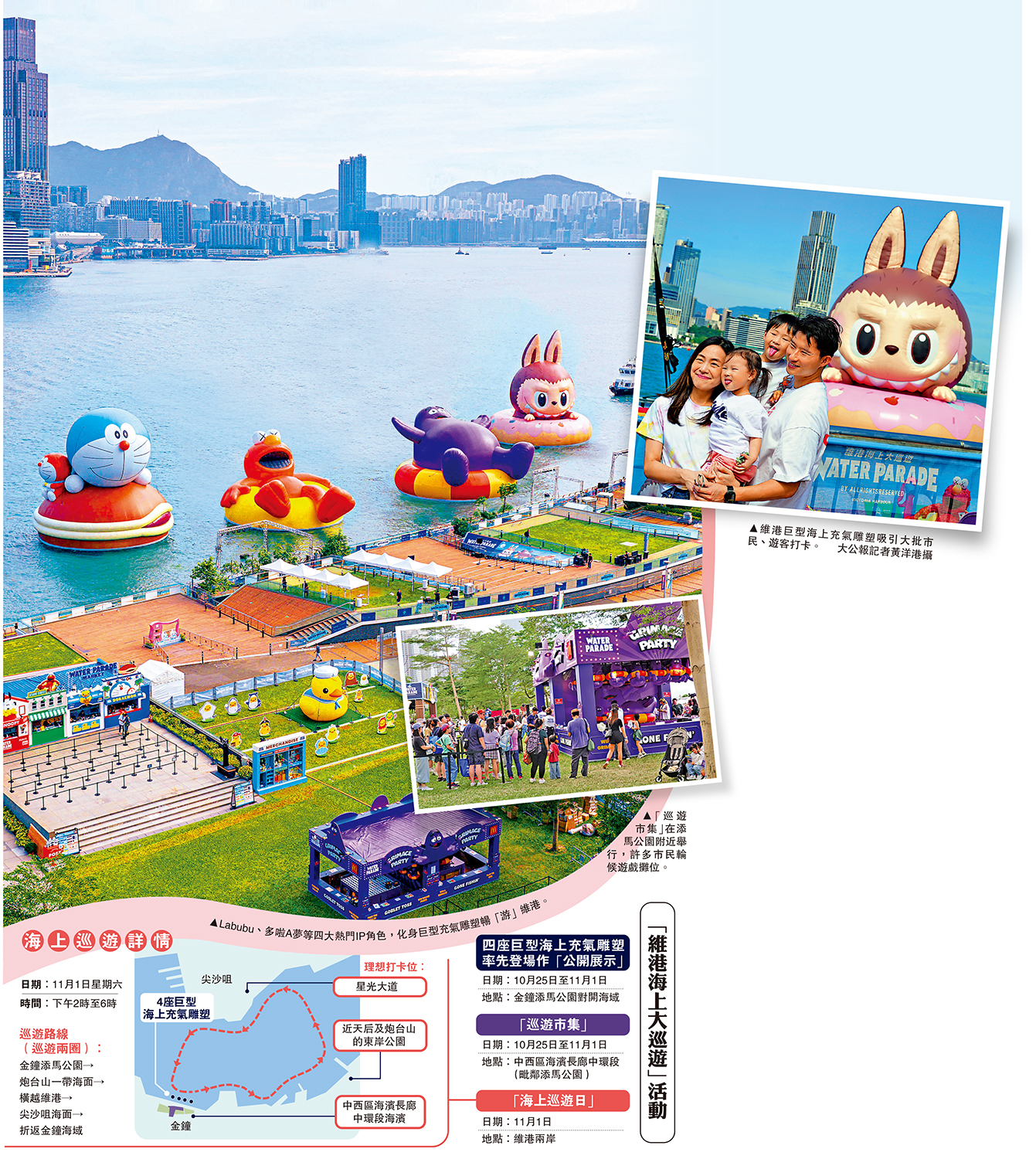 Labubu、多啦A夢、KAWS & 芝麻街(Elmo),以及滑嘟嘟形象的巨型海上充氣雕塑,形態各異,最大的超過20米長,昨起公開展出至11月1日,遊人在海濱長廊地面可以免費欣賞。