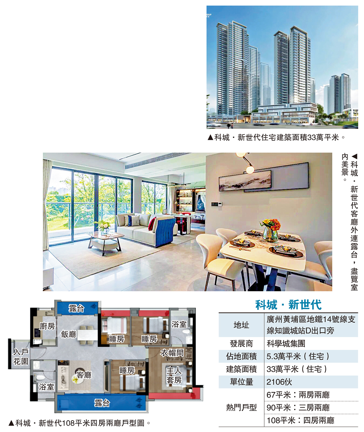 在中新知識城板塊,緊鄰黃埔第一高樓「知識塔」的科城·新世代,同樣受到年輕客戶追捧。項目由黃埔區屬國企科學城集團打造,主打「地鐵+湖景+性價比」,總價約100萬元人民幣(約109萬港元)即可上車,吸引不少剛需客。
