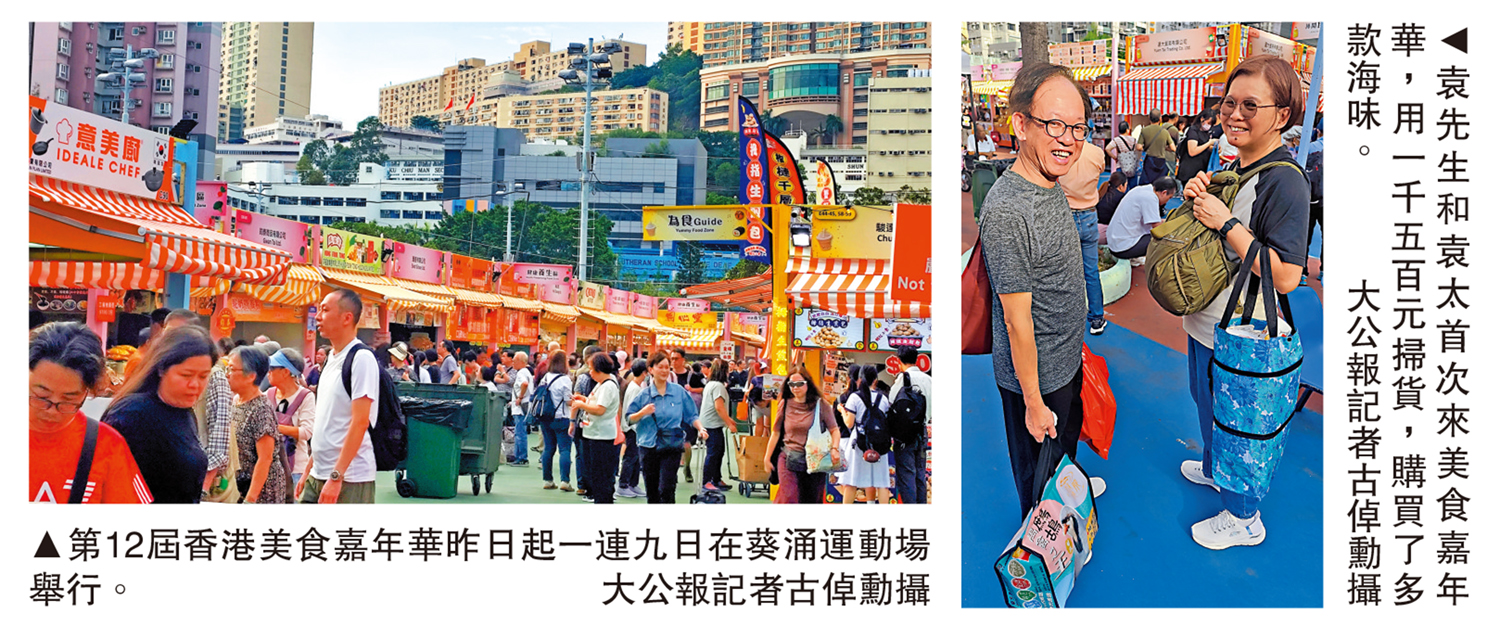 【大公報訊】記者古倬勳報道:由廠商會主辦的第12屆香港美食嘉年華,昨日起一連九日在葵涌運動場舉行。各商戶推出限量一折商品、一元金華火腿等優惠,有市民用逾千元掃貨滿載而歸。有商戶期望今年銷情比去年增兩至三成,相信物美價廉,生意可逐步回升。