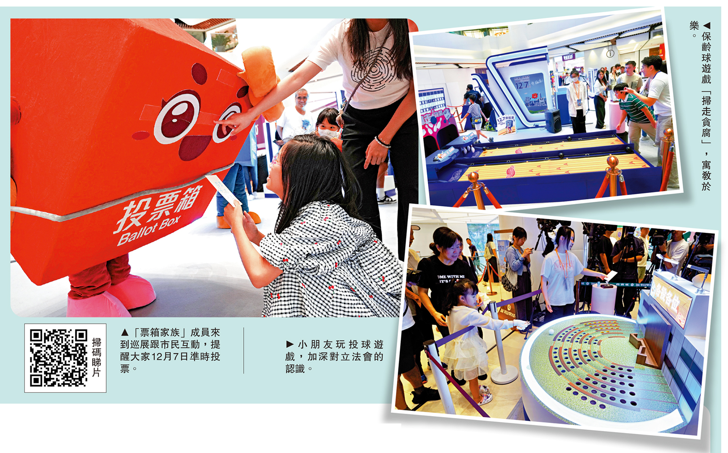 展覽設置多個互動小遊戲,趣味十足,參加者一邊闖關一邊學習選舉小知識;旁邊的「票箱家族」打卡位更是人氣爆棚,不少市民駐足拍照留念。現場可見不少家長帶着小朋友排隊玩遊戲,孩子們眉飛色舞;工作人員則耐心講解投票須知與立法會職能,市民邊玩邊學。多位市民表示,透過互動遊戲,更了解立法會運作與選舉流程,對即將誕生的第八屆立法會充滿期待,承諾將於12月7日投票,履行公民責任。\大公報記者 黃佩琳、李慧妍(文) 何嘉駿(圖)