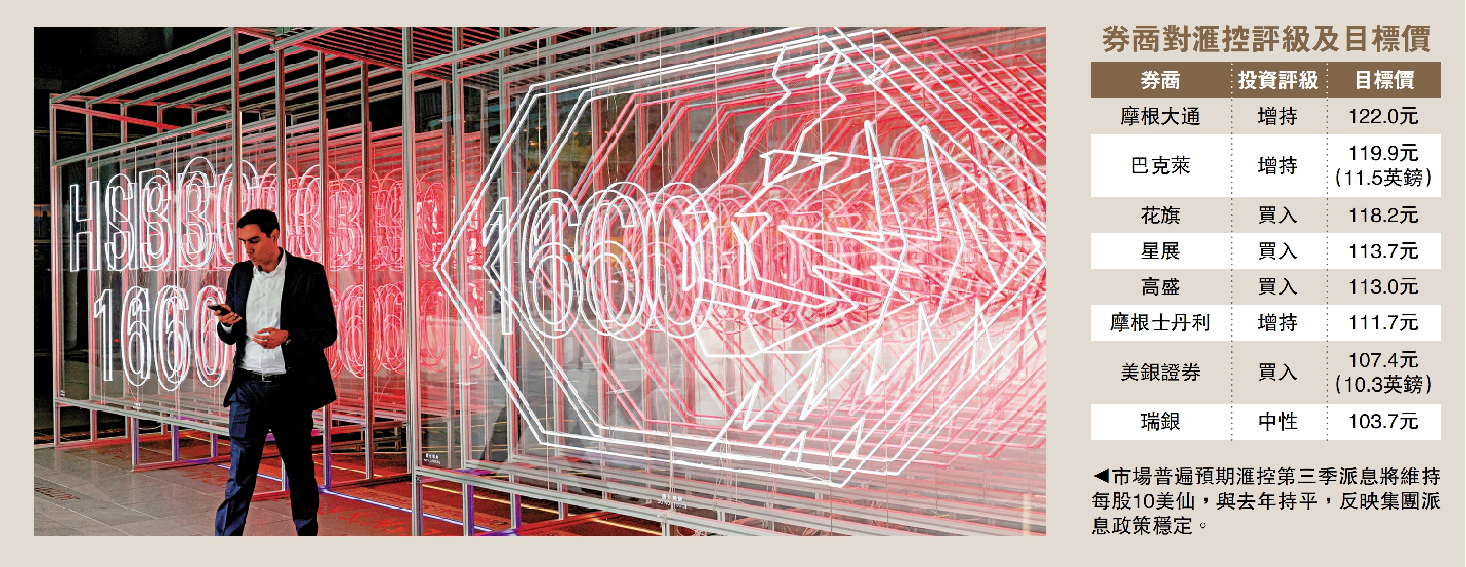 股東回報方面,市場普遍預期第三季派息將維持每股10美仙,與去年持平,反映集團派息政策穩定。普通股權一級資本比率預計維持在14.5%至14.7%之間,顯示集團資本狀況仍然穩健。投資者也期待管理層就未來派息政策、資本規劃,以及私有化恒生銀行(00011)後的協同效應,提供更清晰指引。由於多間大行給予滙控買入評級(見表),反映私有化恒生的潛力獲市場重視。此外,集團未來息差走向、非利息收入增長,以及本港房地產信貸風險管控預料亦是投資者關注的焦點。