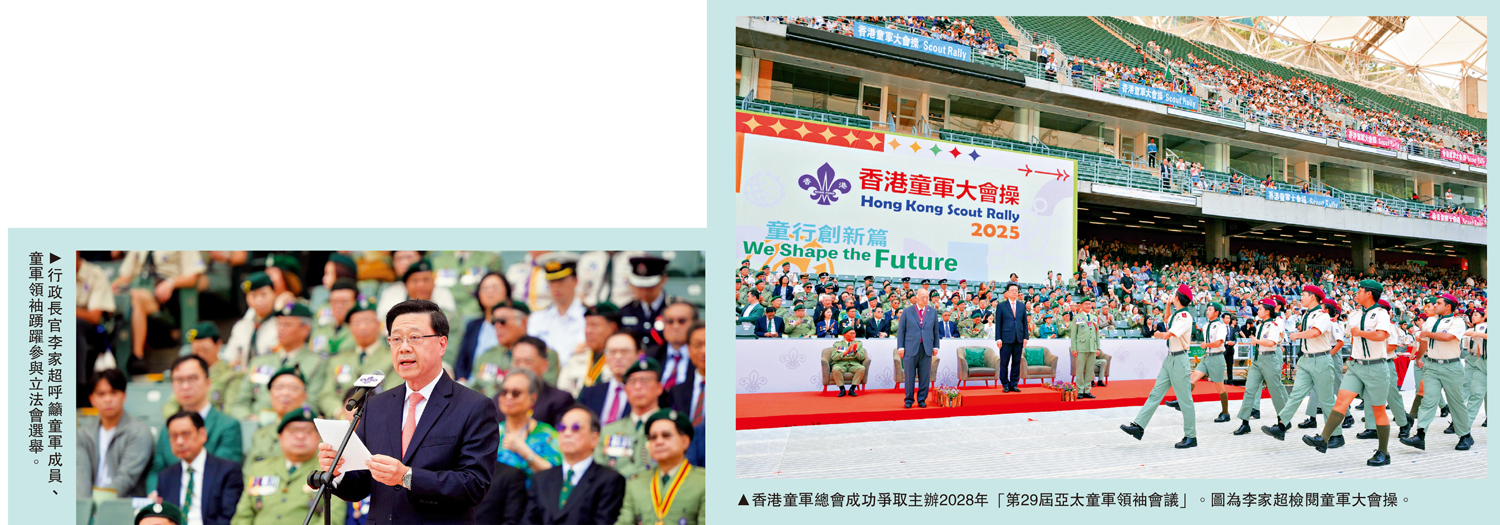 12月7日將舉行第八屆立法會換屆選舉,行政長官李家超昨日出席「香港童軍大會操2025」時,呼籲是選民的童軍成員、童軍領袖踴躍參與立法會選舉,履行公民責任和社會責任,投下神聖一票,選出賢能的立法會議員。李家超強調,政府重視青年發展,希望培育香港青年成為愛國愛港、具世界視野,具正向思維,有技能、有抱負的新一代,並鼓勵青年善用政府推出的計劃、平台和設施,提升自我成長。\大公報記者 龔學鳴