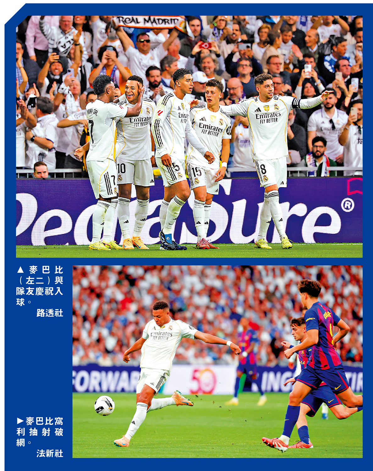 上周日的西甲「國家打吡戰」,皇家馬德里主場以2:1力克宿敵巴塞隆拿後,將榜首領先對方的優勢擴大至5分,其中射手基利安麥巴比又有進賬,連續7場聯賽有「士哥」並以11球高踞射手榜首位,腳風極順,反觀對手巴塞的進攻主將耶馬爾沒有入球或助攻,表現比較沉寂之餘,完場後更成為雙方球員爆發小衝突的導火線。兩隊目前最炙手可熱的球星,在今場打吡遭逢天與地之差別。\大公報記者 譚德龍