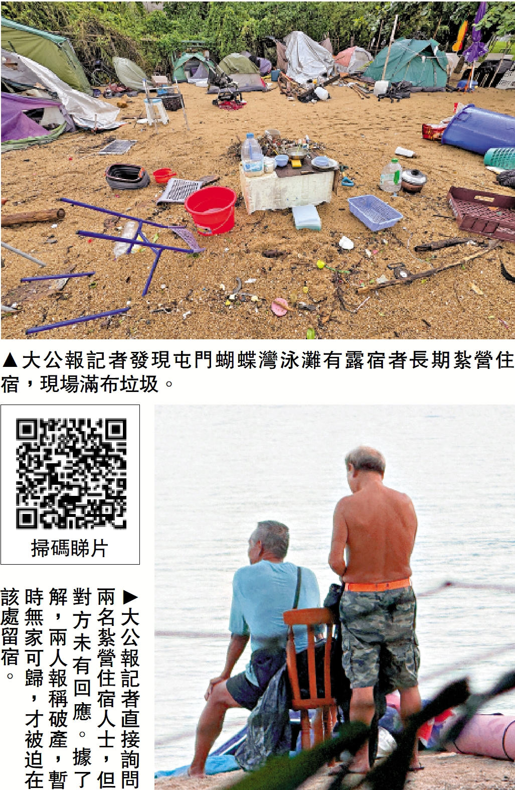 屯門蝴蝶灣泳灘位於龍門路,是區內第二長海岸線的泳灘,吸引不少泳客清晨前來游水,不少旅客假日也會到此暢泳消遣。泳灘範圍由康文署負責管理,已豎立告示牌,提示任何人不得在泳灘內紮營住宿,但兩名露宿者仍然視若無睹,持續多年在該處紮營。據了解,涉事位置屬於天然沙灘,管理上存在「灰色地帶」,並不屬於康文署管理範圍,因而較難執法。