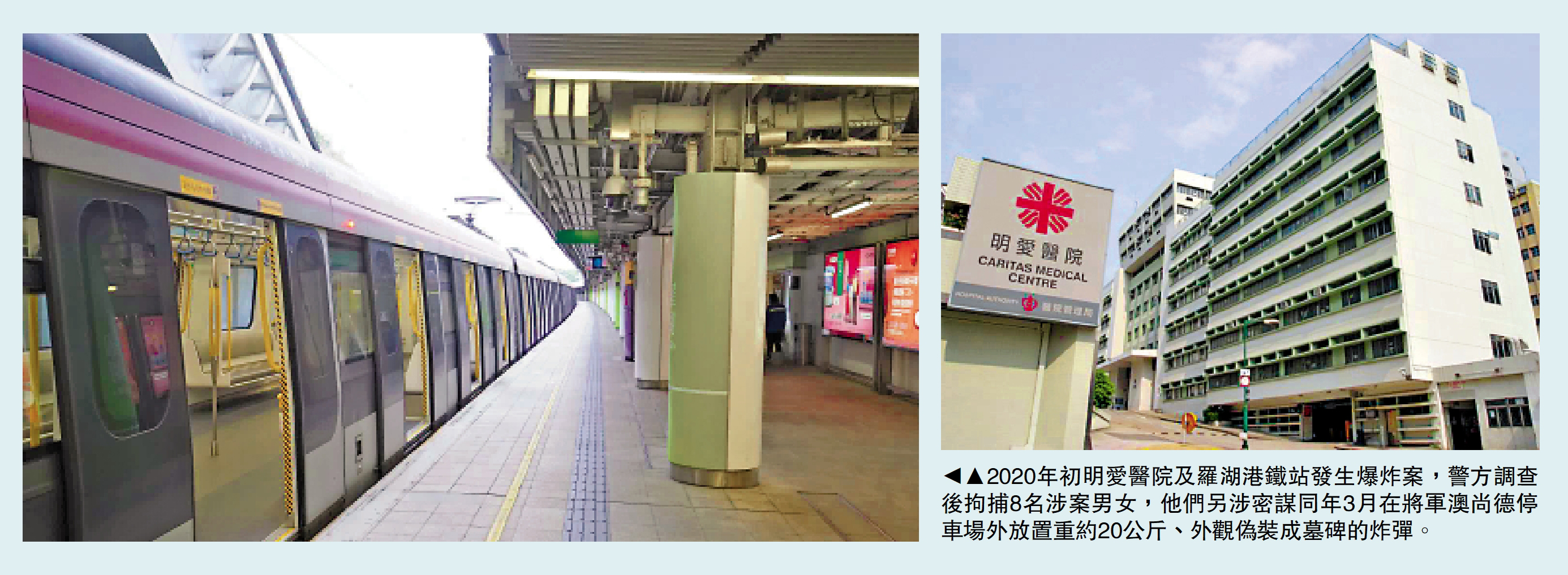 圖﹕2020年初明愛醫院及羅湖港鐵站發生爆炸案,警方調查後拘捕8名涉案男女,他們另涉密謀同年3月在將軍澳尚德停車場外放置重約20公斤、外觀偽裝成墓碑的炸彈。