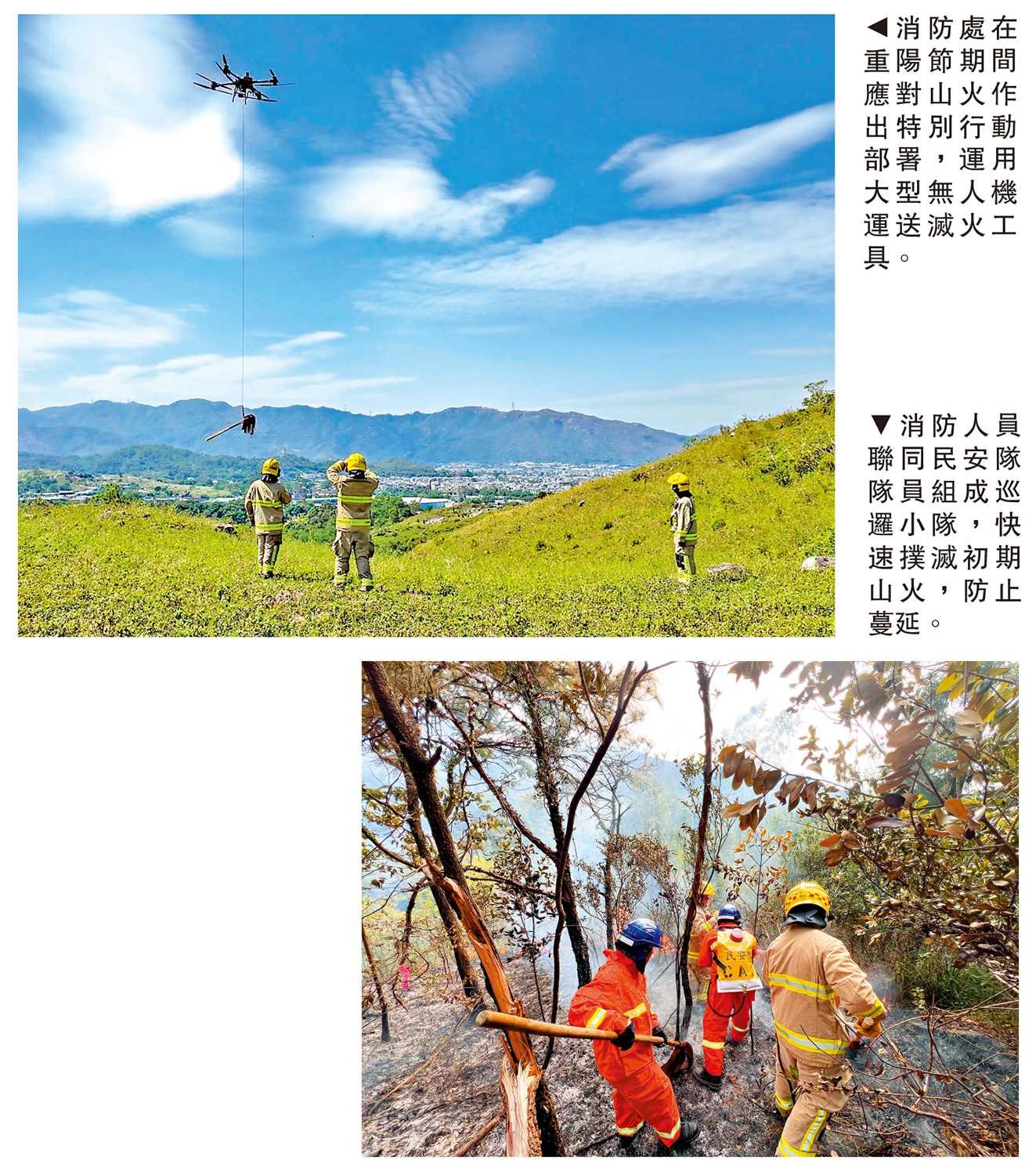 【大公報訊】記者賴振雄報道:明日(29日)是重陽節,消防處嚴陣以待,設立高級指揮室加強協調和應對山火的能力,並配合使用無人機,包括在掃墓熱點使用搭載揚聲器的無人機廣播防火信息,搭配自動化無人機機場在郊野地區自動定期巡邏,並配合人工智能技術以偵測早期火災,更早掌握現場情況及作出相應部署,一旦發生山火,將運用可負載30公斤的大型無人機運送滅火工具,提升行動效率。