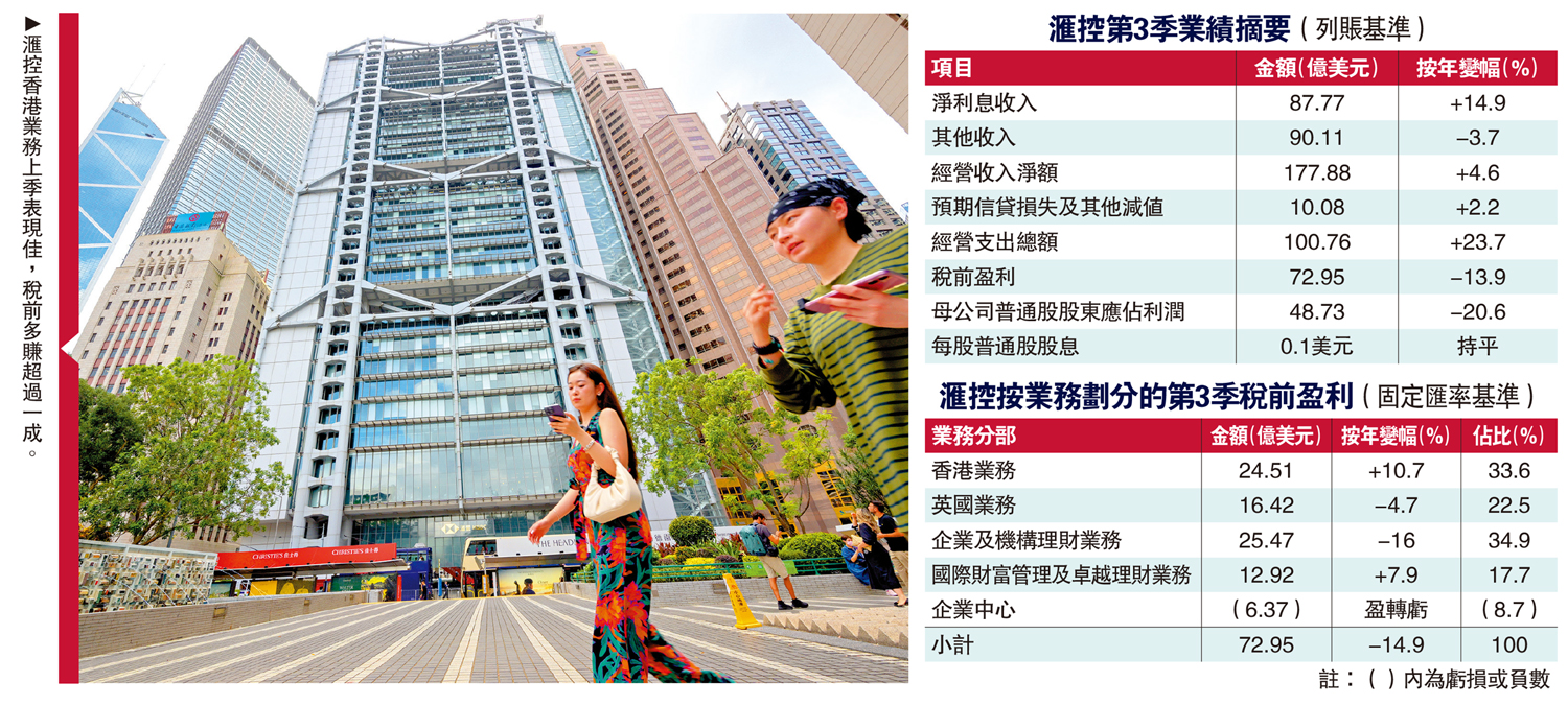 今年首九個月合計,滙控錄得稅前盈利231.05億元,跌23.1%;母公司普通股股東應佔利潤則為163.83億元,跌27.9%。