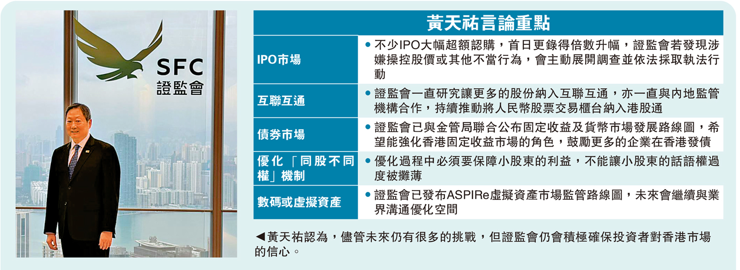 黃天祐表示,面對變化巨大的市場,現有手段或許會不合時宜,需要適當優化,故此,過去一年證監會與業界用了大量時間溝通,一些新的政策若令業界經營成本上升,證監會也會作出檢討。此外,證監會一直積極與港交所(00388)合作,讓港交所作為前線監管者,而證監會則確保港交所的金融基建有能力應對市場的容量。